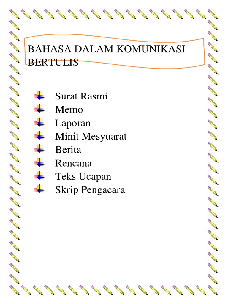 Bahasa bahasa memainka memainkan n peranan yang yang sangat sangat bertulis bertulis dan komunikas komunikasii khalayak khalayak. Bahasa dalam komunikasi lintas budaya. Bahasa merupakan alat komunikasi yang paling efektif untuk menyampaikan gagasan, pikiran, maksud dan tujuan kepada orang lain. Mod komunikasi, yang menggunakan teks bertulis atau bercetak untuk bertukar maklumat dikenali sebagai komunikasi ditulis. Definisi menurut pusat rujukan persuratan melayu (prpm) • surat :
