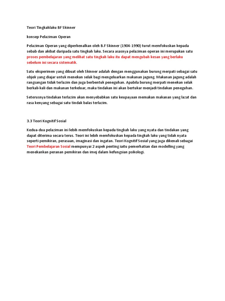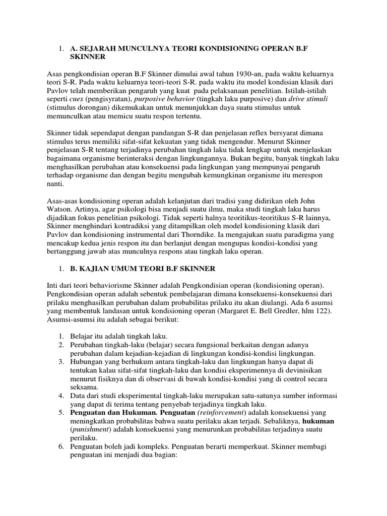 Hal ini terjadi karena menurut pandangan thorndike bahwa belajar merupakan proses interaksi antara stimulus dan respon. Skinner berpendapat, bahwa tujuan psikologi adalah meramal dan mengontrol tingah laku. Jadi hakekat teori skinner adalah teori belajar, bagaimana individu menjadi memiliki perilaku baru, menjadi lebih terampil, menjadi lebih tahu. Berikut ini adalah file tentang jurnal teori tingkah laku skinner yang bisa bapak/ibu unduh secara gratis dengan menekan tombol download pada tautan link di bawah ini. Menurut teori behavioristik belajar adalah perubahan tingkah laku sebagai hasil dari pengalaman (gage, berliner, 1984).