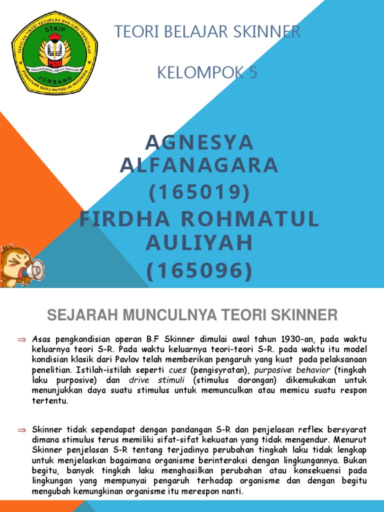 Presentation1 Skinner from image.slidesharecdn.com Jurnal doc / searching for: Dinamika interaksi organisme dengan lingkungan itu sama untuk semua jenis mahkluk. Jadi hakekat teori skinner adalah teori belajar, bagaimana individu menjadi memiliki perilaku baru, menjadi lebih terampil, menjadi lebih tahu. Skinner berpendapat, bahwa tujuan psikologi adalah meramal dan mengontrol tingah laku. Dari uraian diatas dapat disimpulkan bahwa teori operant conditionin suatu teori yang mengunakan konsekuensi yang menyenangkan dan tidak menyenangkan dalam mengubah tingkah laku. Menurut teori behavioristik tingkah laku manusia dikendalikan oleh ganjaran atau penguatan dari lingkungan. Tokoh teori belajar operant conditioning adalah burrhus frederic skinner. Teori behaviorisme merupakan kajian saintifik mengenai tingkah laku manusia.