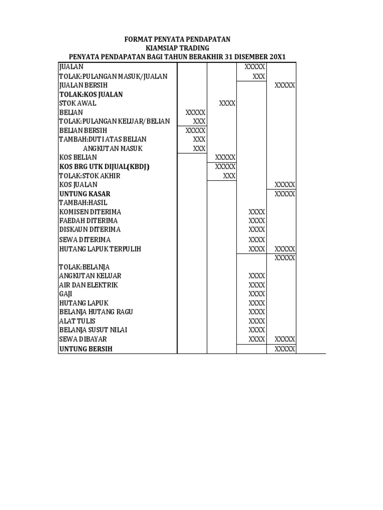 F5_AKAUN_06_07 Akaun Pendapatan dan Perbelanjaan - Jom Tuisyen from www.jomtuisyen.com Ada dua cara untuk menghitung berikut ini contoh penghitungan pendapatan per kapita riil dan pendapatan per kapita nominal. Penyata pendapatan adalah penyata kewangan yang membentangkan prestasi kewangan syarikat dalam tempoh perakaunan tertentu. Ada 20 gudang lagu penyata pendapatan dan penyata kedudukan kewanga terbaru, klik salah satu untuk download lagu mudah dan cepat. Ini menunjukkan status dan kemajuan kewangan syarikat pada masa yang dikaji. Pendapatan ialah wang yang yang diterima atau yang akan diterima oleh perniagaan pada suatu tarikh perbelanjaan akan mengurangkan ekuiti pemilik perniagaan. Dan keuntungan atau kerugian, secara tradisinya sepanjang tempoh satu bulan. Juga dipanggil penyata untung rugi. Penyata pendapatan adalah penyata kewangan yang paling biasa dan menunjukkan pendapatan syarikat;